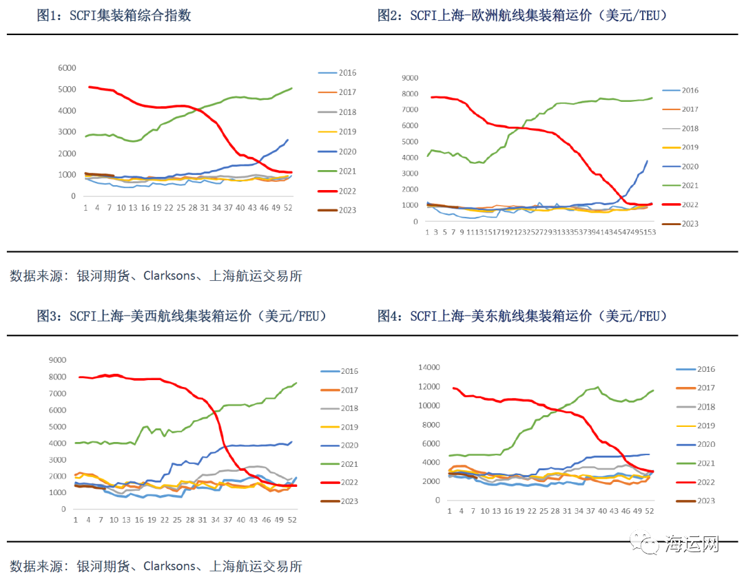 运价方面:2月集装箱运价延续下跌,节后淡季集装箱运输市场供需格局继续走弱。具体来看,截至2月24日当周,上海出口集装箱运价指数SCFI报946.68点,环比-2.9%,同比-80.4%。其中上海-美西线运价报1234美元/FEU,环比-3.1%,同比-84.7%;上海-欧洲航线运价报882美元/TEU,环比-3.1%,同比-88.3%。整体来看,春节过后集装箱航运市场表现平淡,集装箱运输供需格局延续宽松。(查看文章:运价继续下滑!船公司尽其所能......)